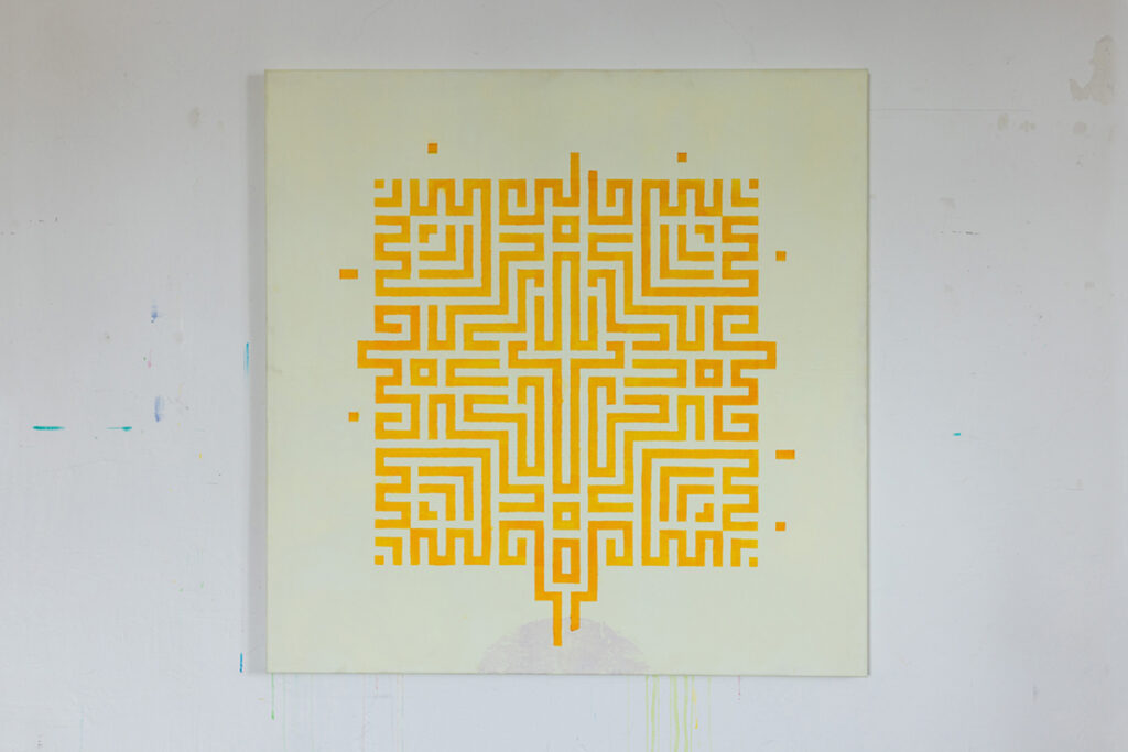 Elemente I: Weltraumbaum. 135 x 135 cm, acrylics and colored ink on canvas, 2025.